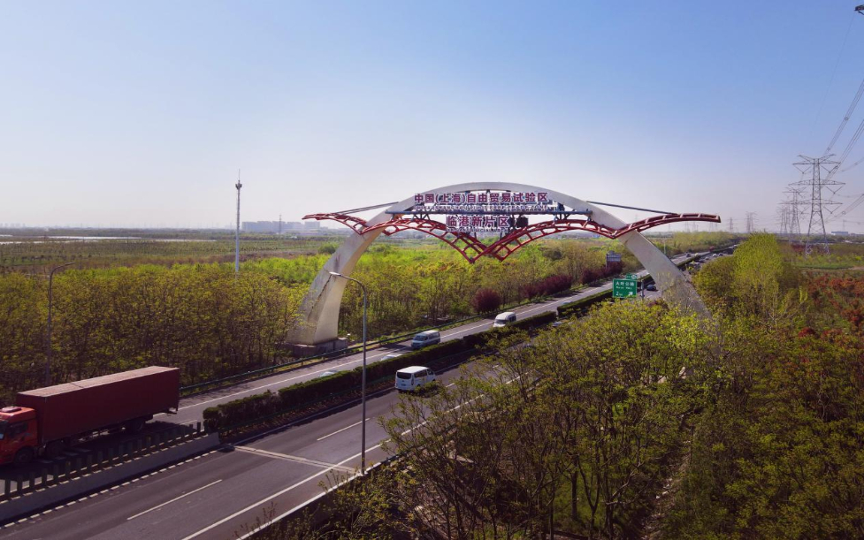 2025年4月15日拍摄的位于沪芦高速公路上的上海自贸试验区临港新片区的标志“海鸥门”(无人机照片)。新华社记者方喆摄