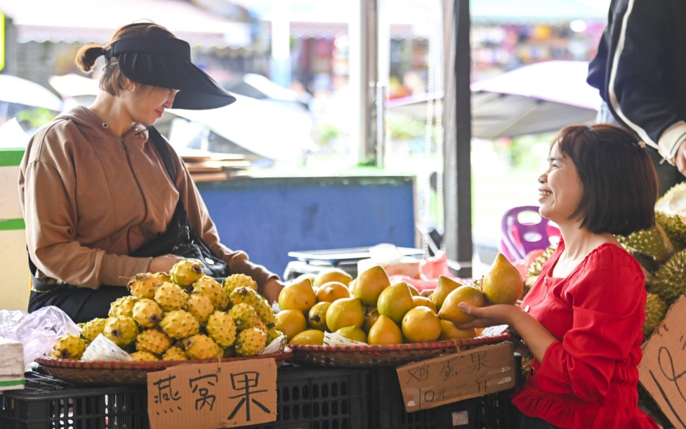 4月17日,在广西东兴口岸附近的一处水果市场,顾客在选购进口水果。新华社记者曹祎铭摄