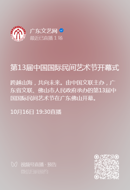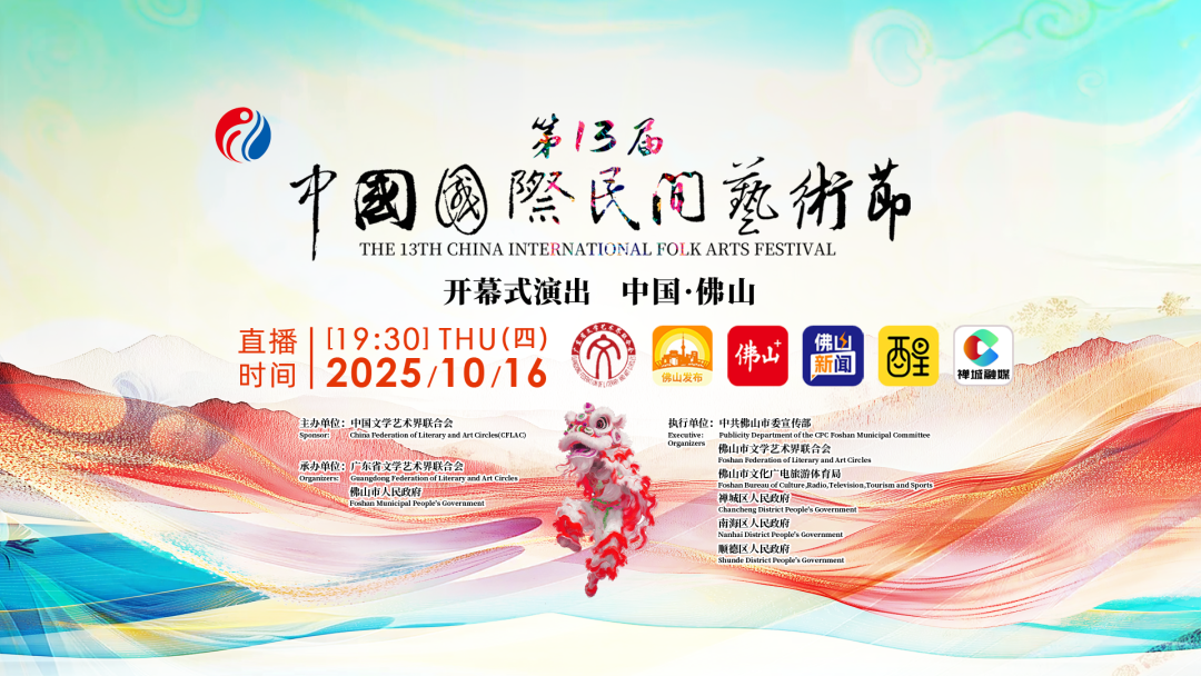 跨越山海,共向未来。 由中国文联主办,广东省文联、佛山市人民政府承办的 第13届中国国际民间艺术节将于今日在广东佛 山开幕。今晚19:30广东文艺网视频号、佛山传媒全媒体平台矩阵将直播开幕式盛况。