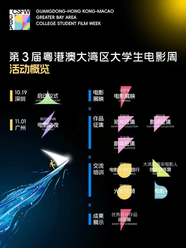 本届电影周设立影评、剧本、短片三大征集单元,面向内地及港澳、东南亚高校学生开放。其中,“文本场”单元鼓励创作聚焦大湾区题材的剧本,获奖作品将有机会获得业内公司孵化支持。