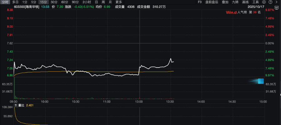 在证监会立案调查告知书披露后,10月17日,海南华铁股价开盘跌停,盘中小幅回升,最终收跌6.96%。