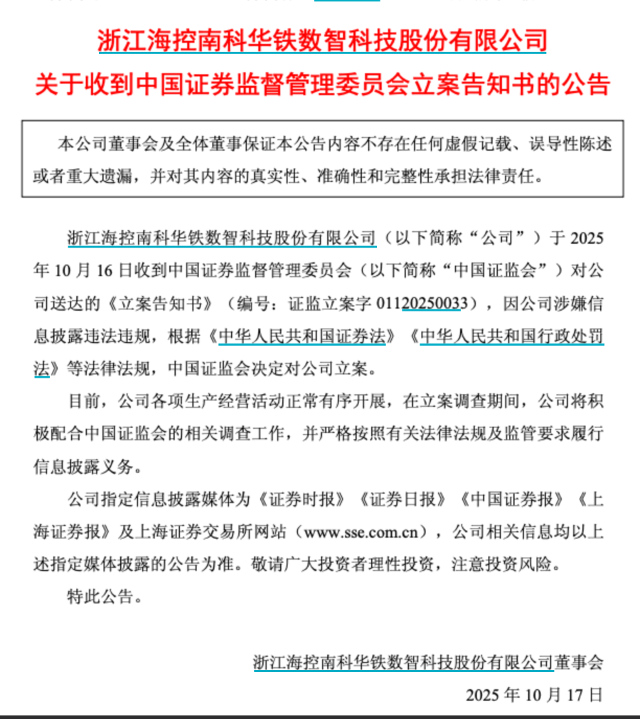 据海南华铁公告,因公司涉嫌信息披露违法违规,根据《中华人民共和国证券法》《中华人民共和国行政处罚法》等法律法规,中国证监会决定对公司立案。
