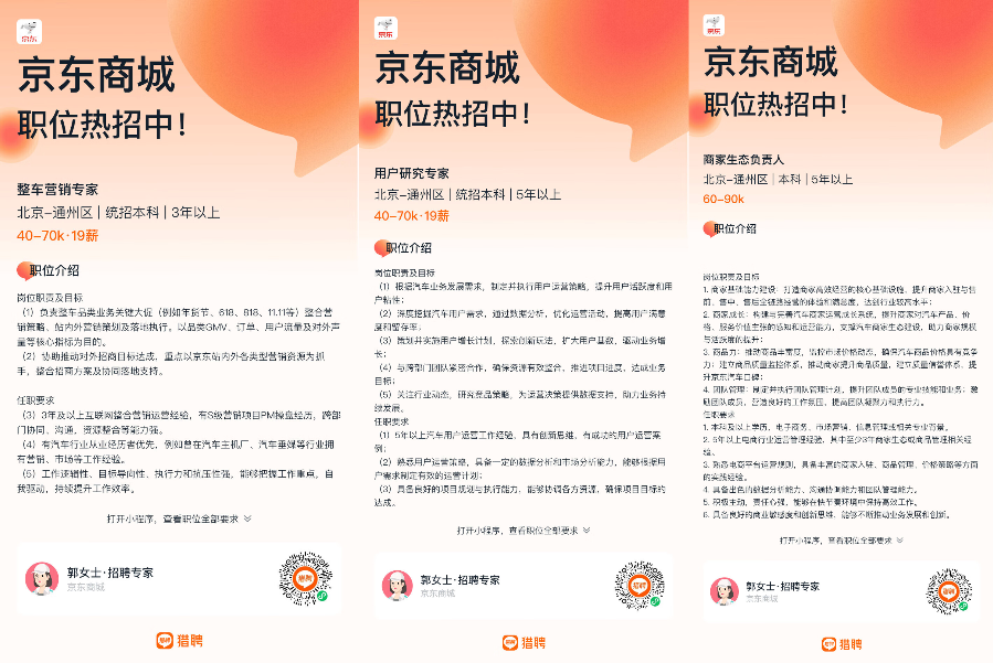多个招聘平台信息显示,京东汽车已释放多个高薪岗位,部分岗位年薪突破百万元。