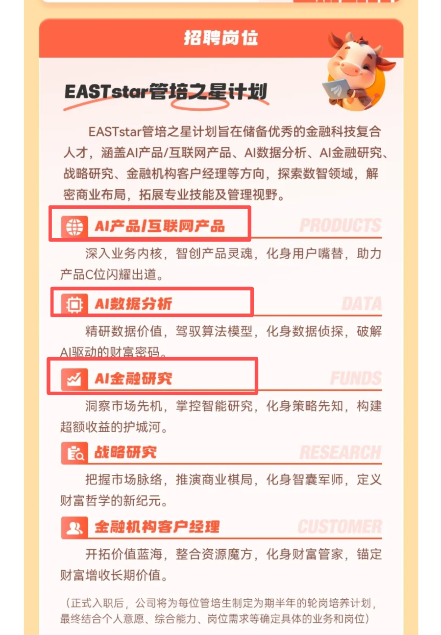 类似的AI岗位设置,在互联网券商及第三方服务平台公司中则更为常见。9月初,同花顺、东方财富先后启动秋招。作为头部互联网券商,东方财富招聘需求主要分为金融业务和金融科技两大类。对比传统券商多在金融业务条线设置管培生,东方财富今年的管培生项目主要面向金融科技复合人才,开设五大方向,其中三大方向均涉及AI领域,包括“AI产品/互联网产品”“AI数据分析”“AI金融研究”。