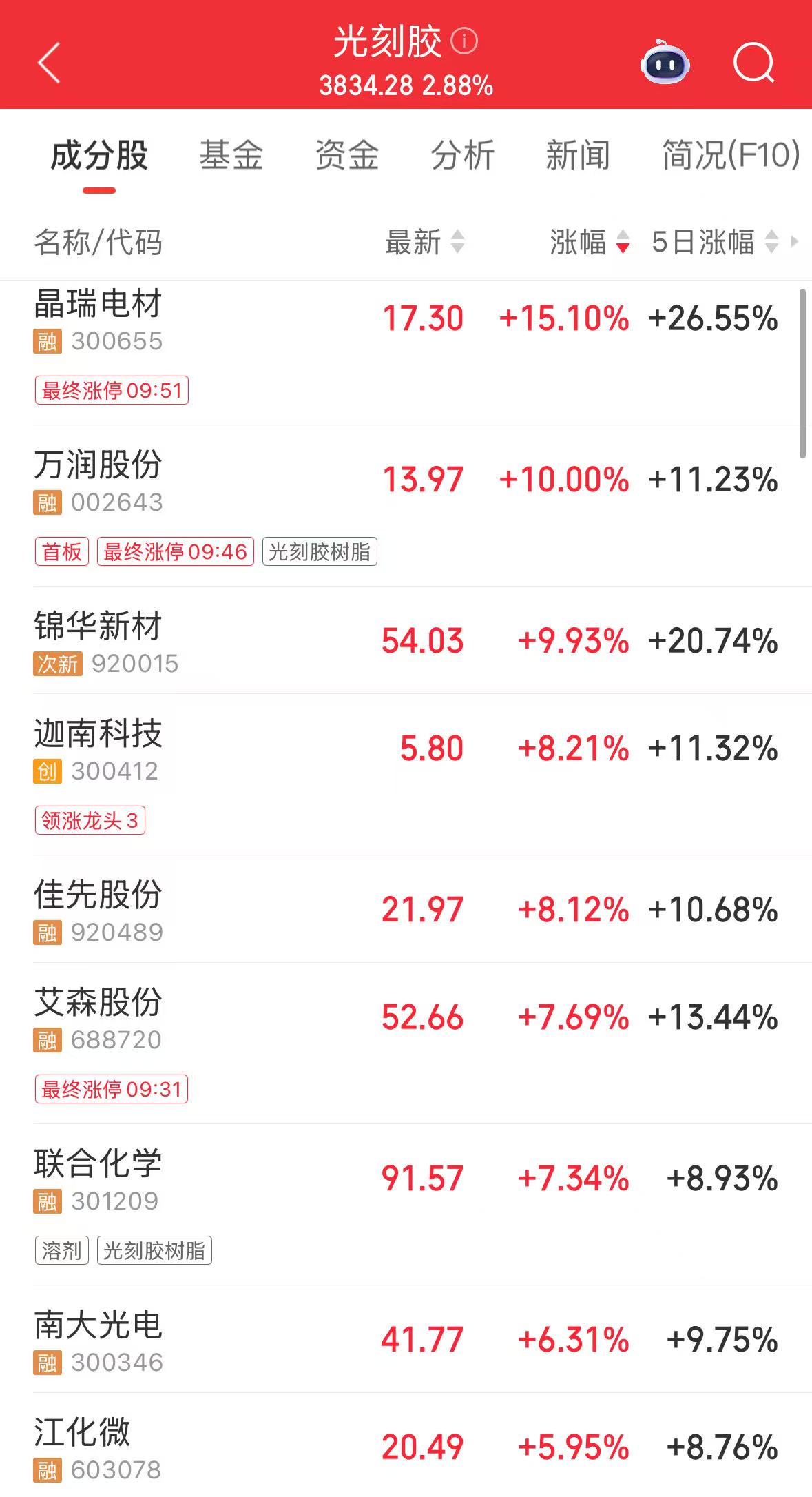 10月27日,光刻胶概念股集体异动,截至午间收盘,万润股份(002643.SZ)涨停,晶瑞电材(300655.SZ)领涨,锦华新材(920015.BJ)、迦南科技(300412.SZ)、佳先股份(920489.BJ)等跟涨。