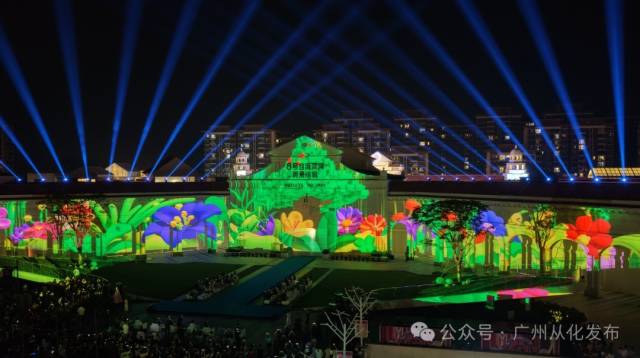 光影秀通过《序章:生态脉动·岭南基因》《中篇:时尚引力·湾区磁场》《终章:未来之境》等三大篇章,以数字光影技术解构从化生态基因,展现从化生态、历史、人文元素,在光影变幻中把从化故事娓娓道来。