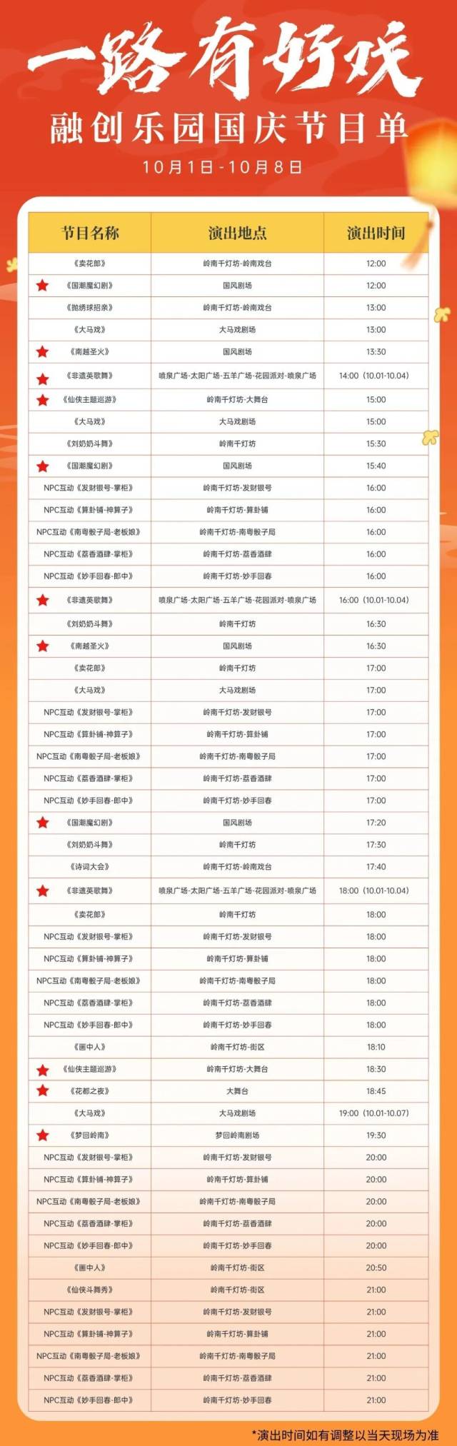国潮英歌舞、南越圣火秀、国潮仙侠大巡游、季惊四座魔幻特技秀、梦回岭南国风实景大秀——“五场沉浸式大秀”演绎华夏之美,非遗×岭南文化×民族文化×国潮文化深度融合,旨在为游客打造一场高密度高质量的中华文化巡礼。