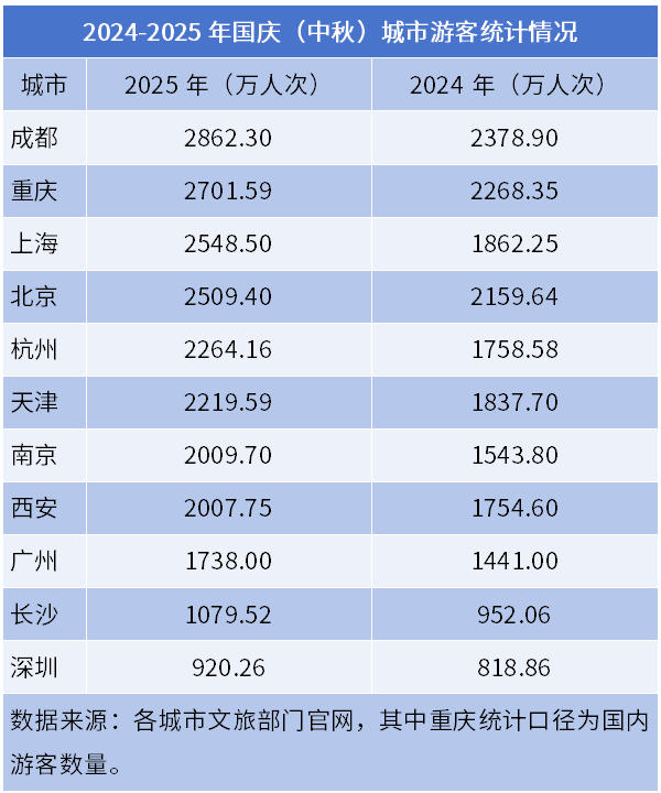 在纳入统计的11座城市中,有8个城市的2025年国庆中秋假期游客总量超过2000万人次,其中成都的游客总量在2024—2025年国庆(中秋)假期连续两年霸榜。而在2024年的国庆假期,11座城市中仅有3座城市的超2000万人次。