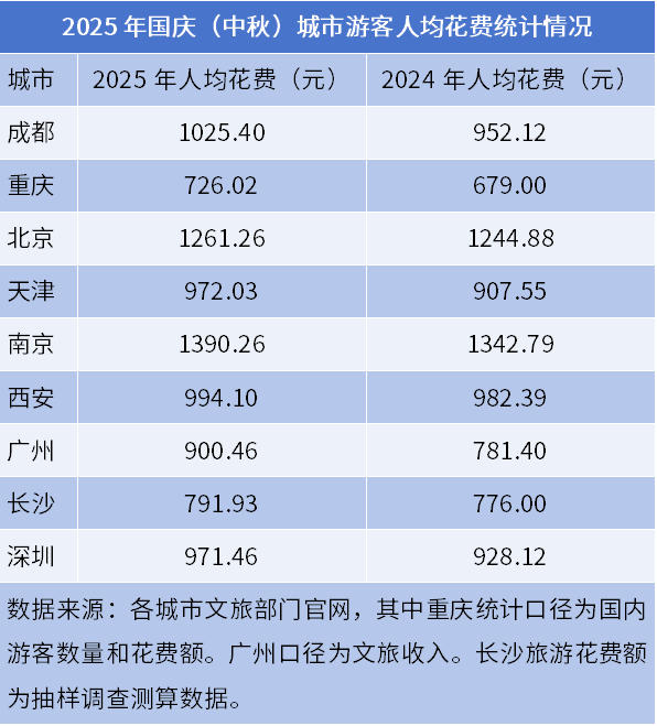 在9座公布游客花费数据的城市中,2025年国庆中秋假期人均花费超1000元的城市从2024年国庆假期的2座(北京、南京)增加1座(成都),其余6座城市尚低于1000元。但所有座城市的游客人均花费较2024年同期都出现明显增长,这是各个城市文旅消费供给能力不断增强的客观展现。