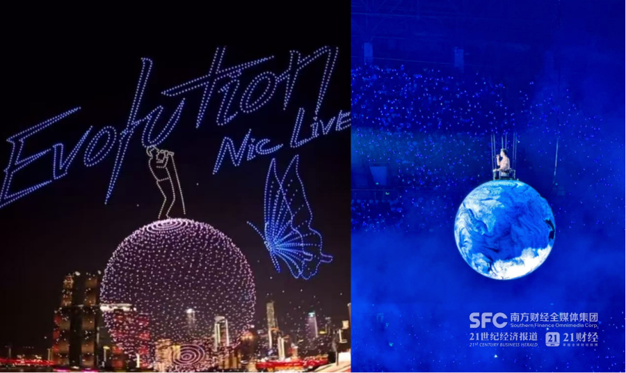 (重庆官方支持的无人机表演出现了谢霆锋演唱会的元素,来自官方直播和21记者)