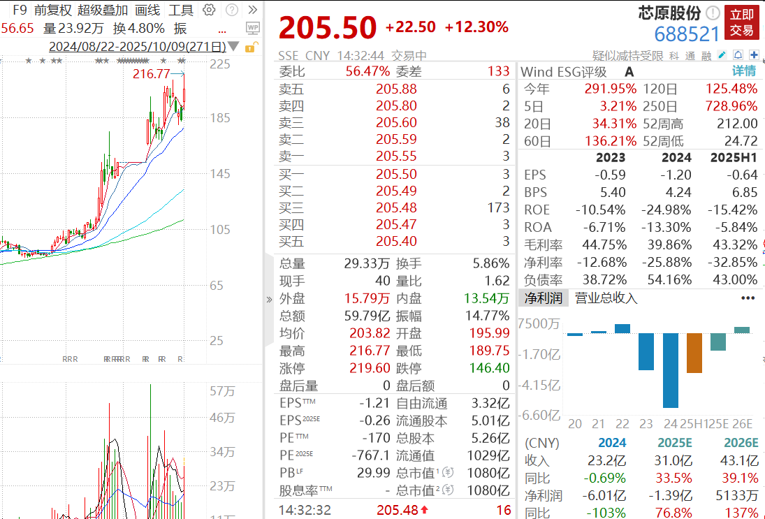 10月9日开盘,芯片半导体全线爆发,芯联集成、海光信息、澜起科技、华润微、中芯国际等涨幅超6%,芯原股份(688521.SH)盘中一度触及216.77元/股,再度刷新股价历史纪录。截至14时33分,芯原股份报205.5元/股,涨幅达12.3%,总市值突破千亿关口达1080亿元。
