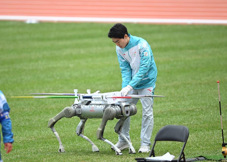 11月19日,志愿者从机器狗上取下标枪。当日,第十五届全国运动会田径项目女子七项全能标枪比赛在广州举行。新华社记者 邓华 摄