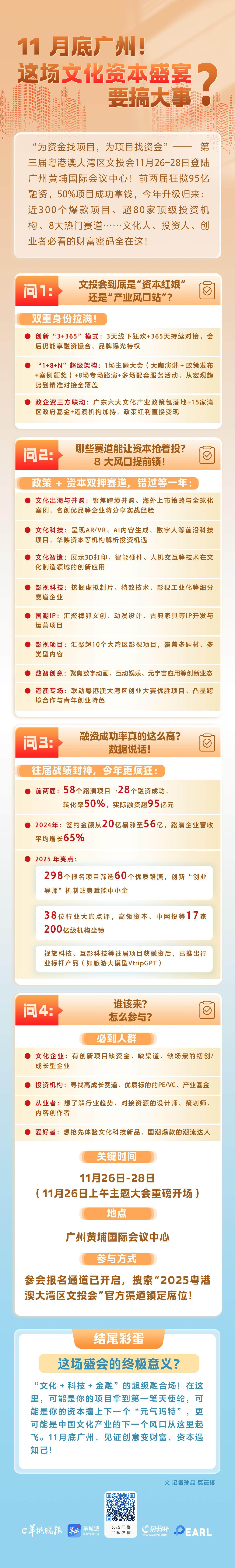 这场以“为资金找项目,为项目找资金”为核心的年度文化产业盛宴,此前已为广州文化企业撬动超20亿元融资,今年全面升级再焕新。想提前锁定行业核心机遇、解锁大会隐藏亮点?别急!我们精心备好“一图读懂”宝藏指南,带你直观get这场文投盛会的干货与惊喜,敬请期待!