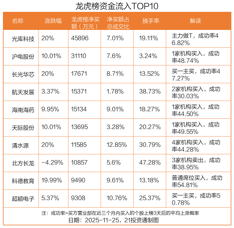 11月25日,上证指数上涨0.87%,深证成指上涨1.53%,创业板指上涨1.77%。盘后龙虎榜数据显示,共有53只个股因当日异动登上龙虎榜,资金净流入最多的是光库科技(300620.SZ),达4.59亿元。