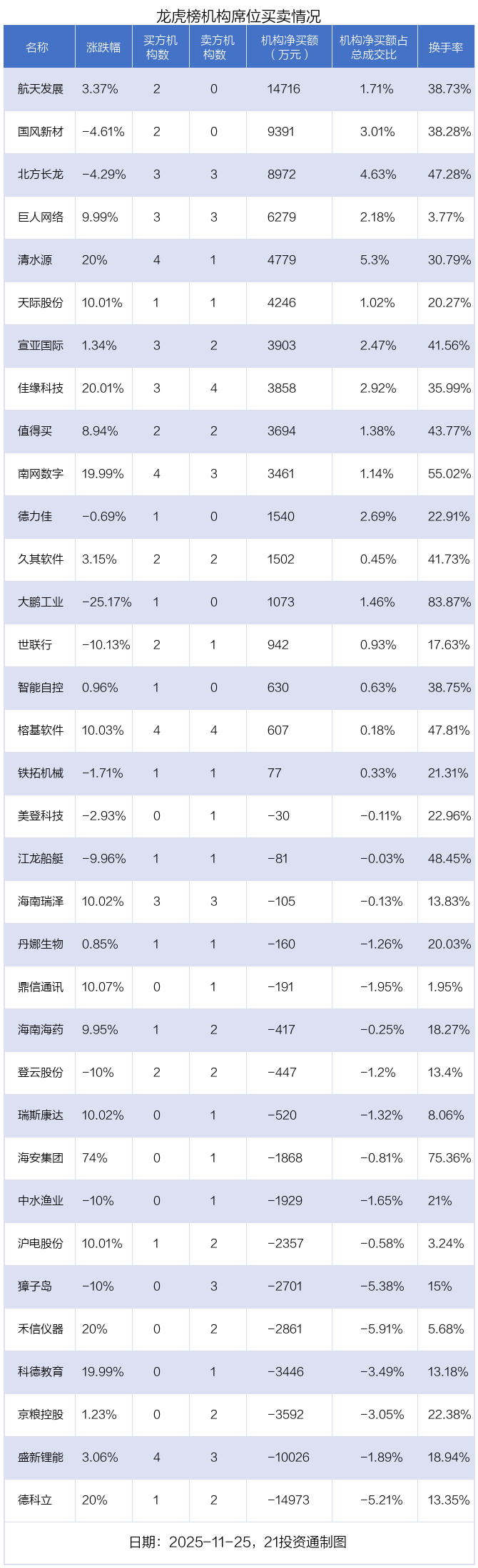 其中,机构净买入金额最多的是航天发展(000547.SZ),当日收盘上涨3.37%,换手率为38.73%。