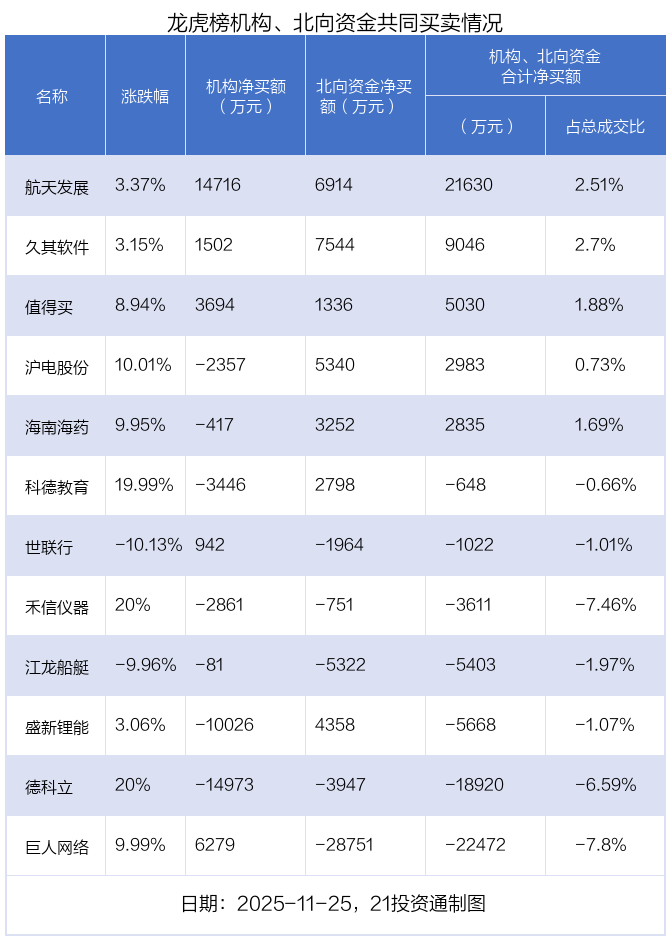 值得注意的是,机构和北向资金共同净买入了久其软件、航天发展、值得买等3股;共同净卖出了禾信仪器、德科立、江龙船艇等3股;在沪电股份,盛新锂能,海南海药,科德教育,世联行,巨人网络上出现分歧,机构净卖出沪电股份2356.96万元,北向资金净买入5339.65万元;机构净卖出盛新锂能1亿元,北向资金净买入4358.23万元;机构净卖出海南海药416.59万元,北向资金净买入3252.04万元;机构净卖出科德教育3446.38万元,北向资金净买入2798.46万元;机构净买入世联行941.89万元,北向资金净卖出1964.17万元;机构净买入巨人网络6278.93万元,北向资金净卖出2.88亿元。