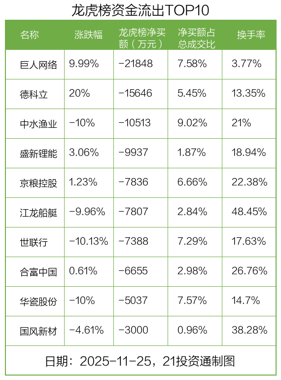 而龙虎榜中资金净流出最多的是巨人网络(002558.SZ),被净卖出为2.18亿元,占总成交金额的7.58%。巨人网络收盘上涨9.99%,换手率为3.77%。