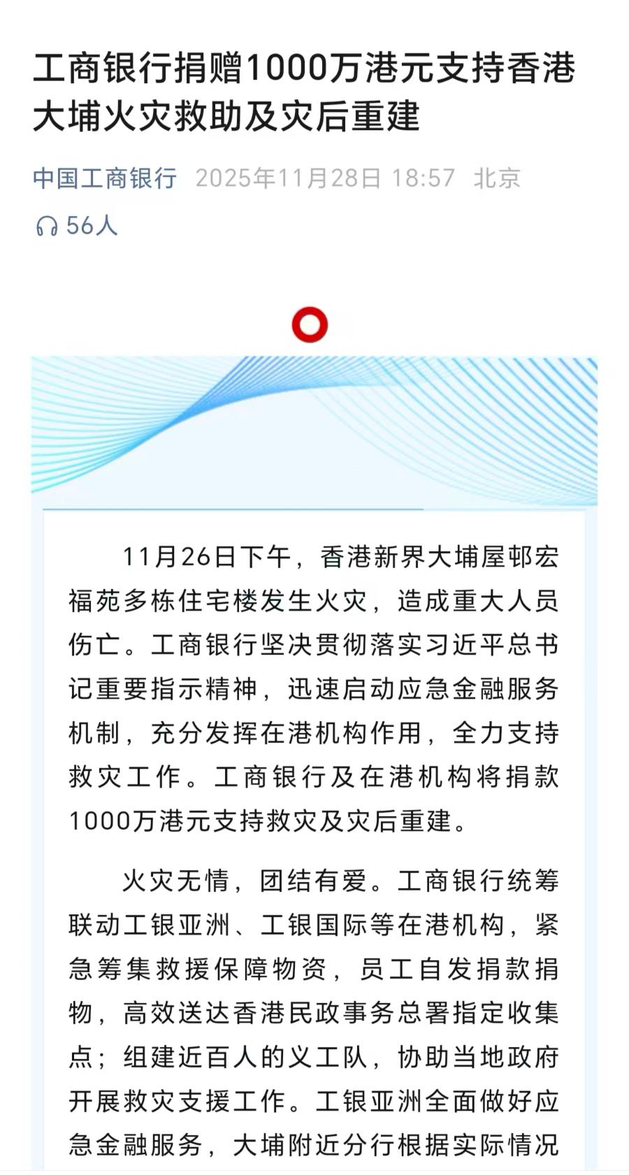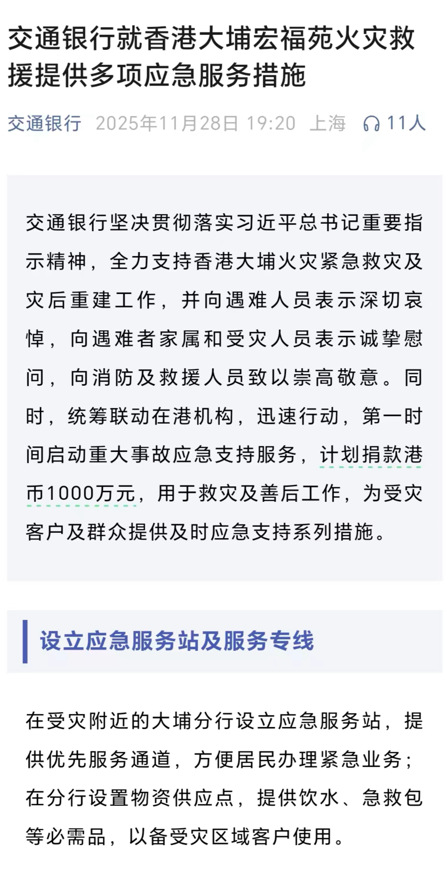 股份行方面,11月28日,浦发银行发文表示,向香港白玉兰慈善基金会捐赠1000万港元,用于支持应急救灾和灾后重建工作。香港大埔火灾发生后,浦发银行高度重视,快速启动应急响应机制,助力受灾人员渡过难关。在港机构香港分行和浦银国际第一时间组织义工团为受灾市民提供生活物资及紧急经济支持;同时,开设应急服务绿色通道,优先办理救灾资金汇划服务,确保金融服务“不断档”。