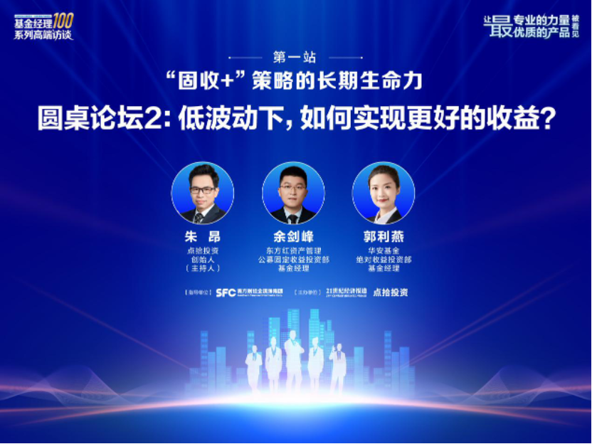 在此背景下,“固收+”策略产品因其股债搭配、追求绝对收益的特性,受到市场广泛关注。为此,在本场活动的圆桌二环节,东方红资产管理公募固定收益投资部基金经理余剑峰与华安基金绝对收益投资部基金经理郭利燕,围绕“低波动下,如何实现更好的收益”这一核心议题展开了一场深度对话。活动由点拾投资创始人朱昂主持。