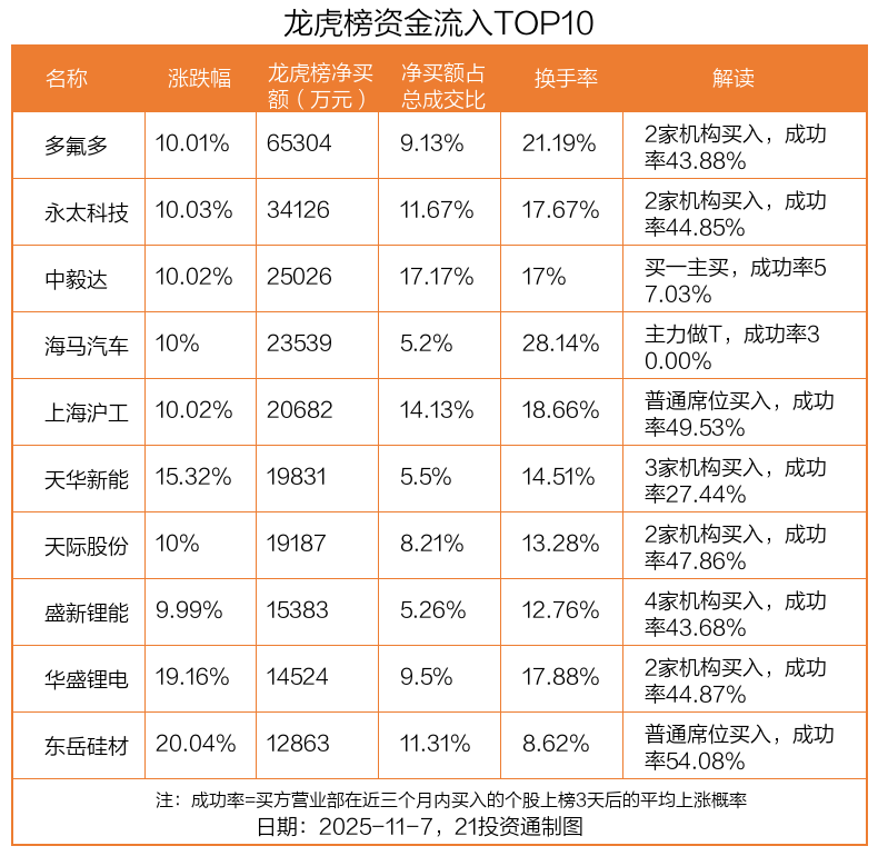 11月7日,上证指数下跌0.25%,深证成指下跌0.36%,创业板指下跌0.51%。盘后龙虎榜数据显示,共有53只个股因当日异动登上龙虎榜,资金净流入最多的是多氟多(002407.SZ),达6.53亿元。