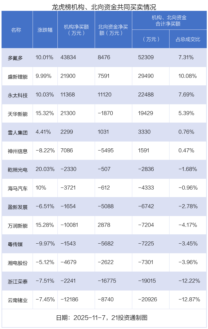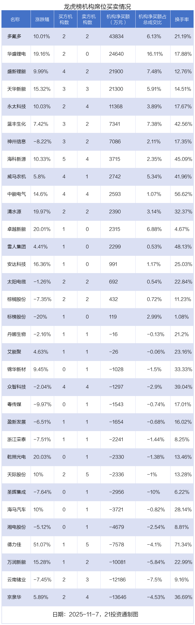 其中,机构净买入金额最多的是多氟多(002407.SZ),当日收盘上涨10.01%,换手率为21.19%。