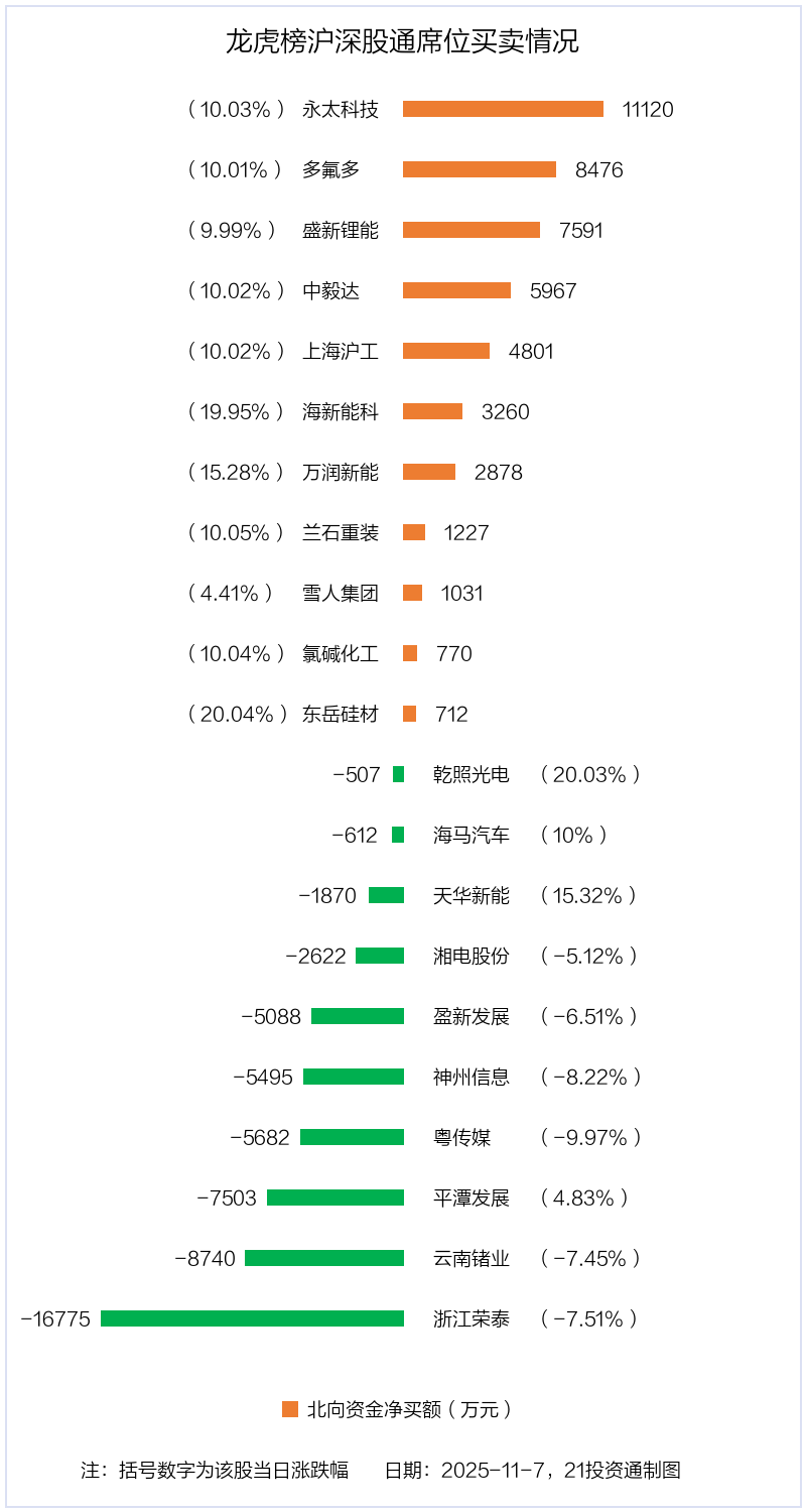 11月7日,北向资金参与龙虎榜中的个股共有21只,合计净卖出7062.04万元。其中沪股通净买入5股,净卖出2股,合计净卖出3753.35万元;深股通净买入6股,净卖出8股,合计净卖出3308.7万元。