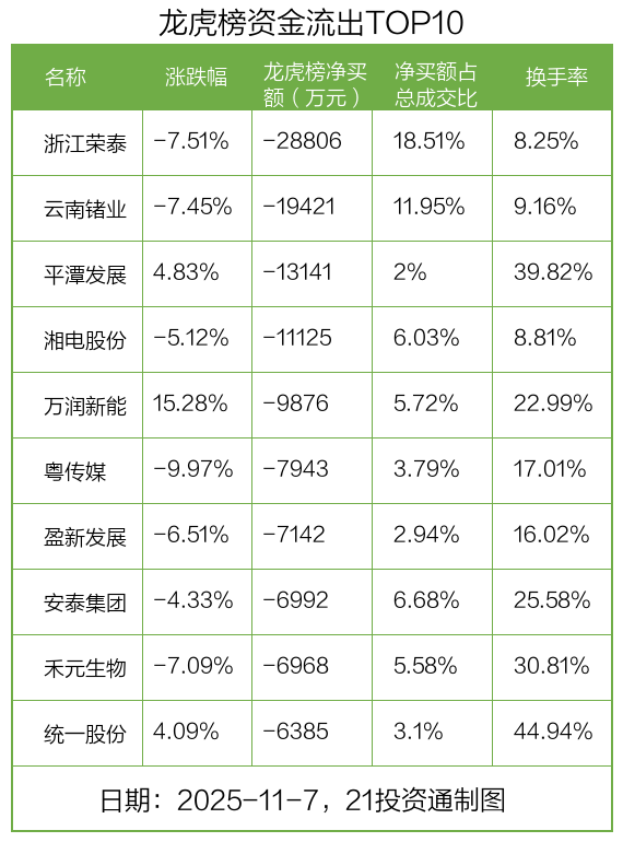 而龙虎榜中资金净流出最多的是浙江荣泰(603119.SH),被净卖出为2.88亿元,占总成交金额的18.51%。浙江荣泰收盘下跌7.51%,换手率为8.25%。