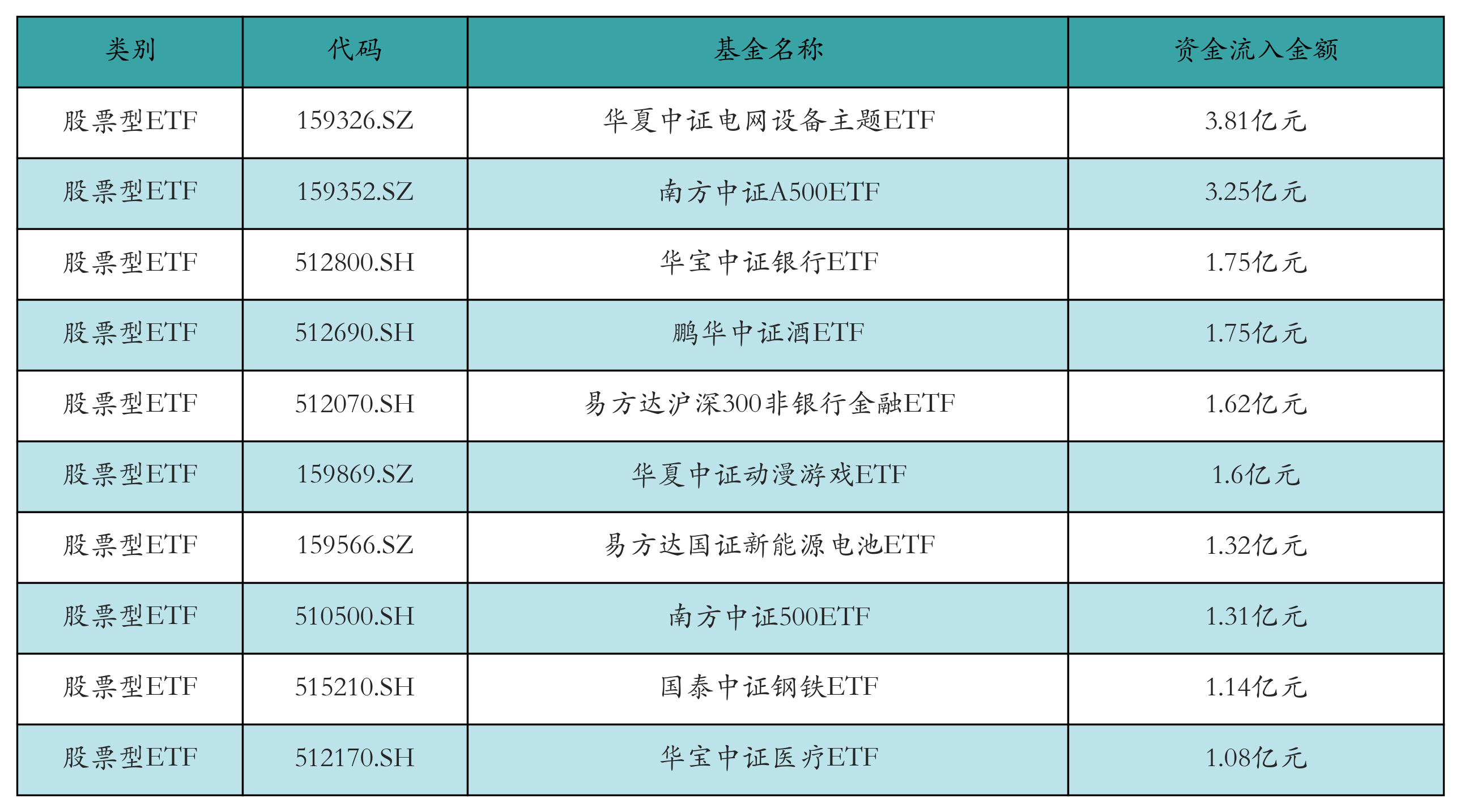 昨日股票型ETF资金流入最多的3只ETF及其流入金额分别为:华夏中证电网设备主题ETF(流入3.81亿元)、南方中证A500ETF(流入3.25亿元)、华宝中证银行ETF(流入1.75亿元)。资金流入前10详情见下表: