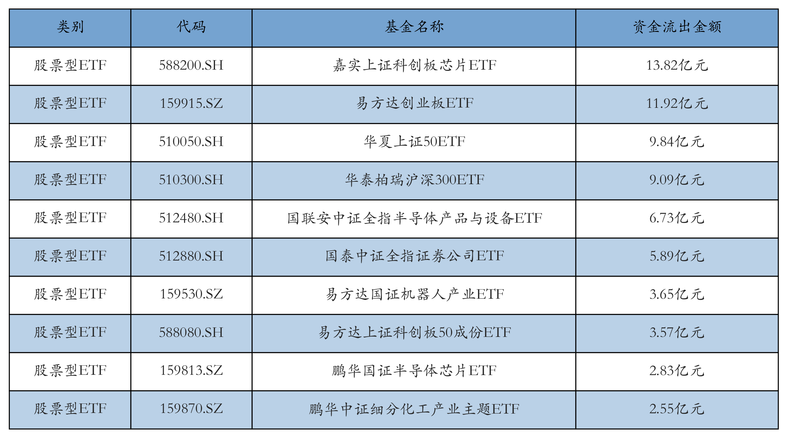 昨日股票型ETF资金流出最多的3只ETF及其流出金额分别为:嘉实上证科创板芯片ETF(流出13.82亿元)、易方达创业板ETF(流出11.92亿元)、华夏上证50ETF(流出9.84亿元)。资金流出前10详情见下表: