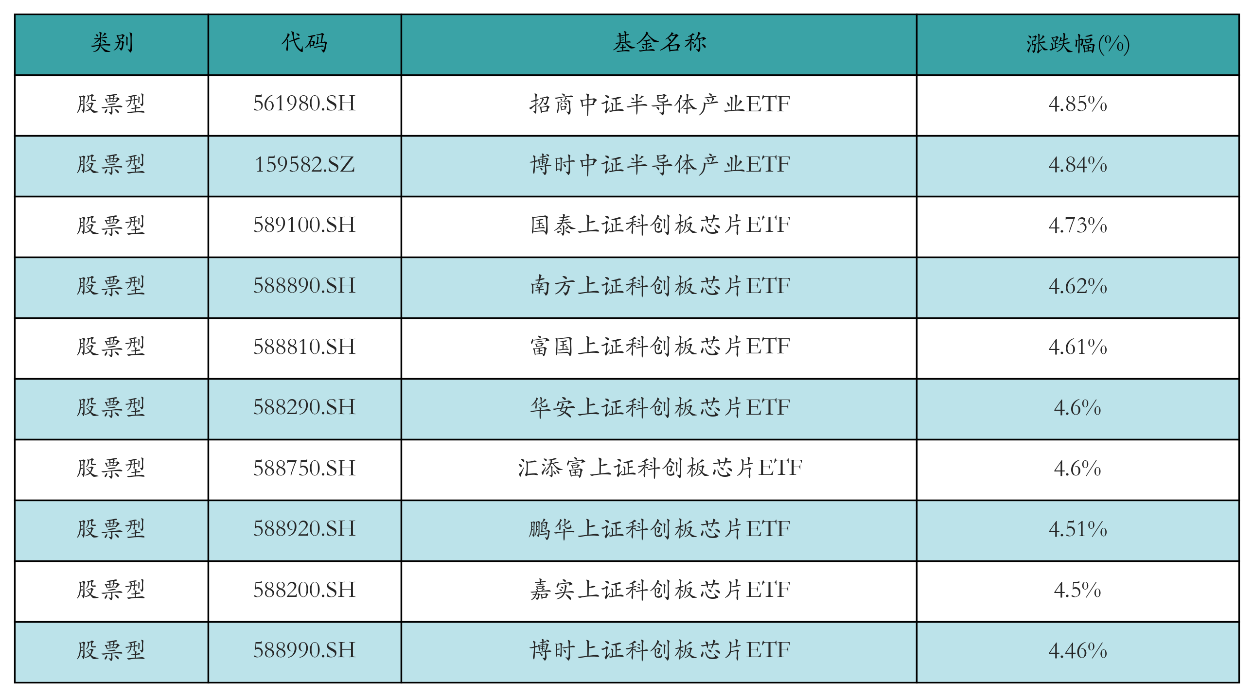 昨日股票型ETF涨幅最高的3只ETF及其收益率分别为:招商中证半导体产业ETF(4.85%)、博时中证半导体产业ETF(4.84%)、国泰上证科创板芯片ETF(4.73%)。涨幅前10详情见下表: