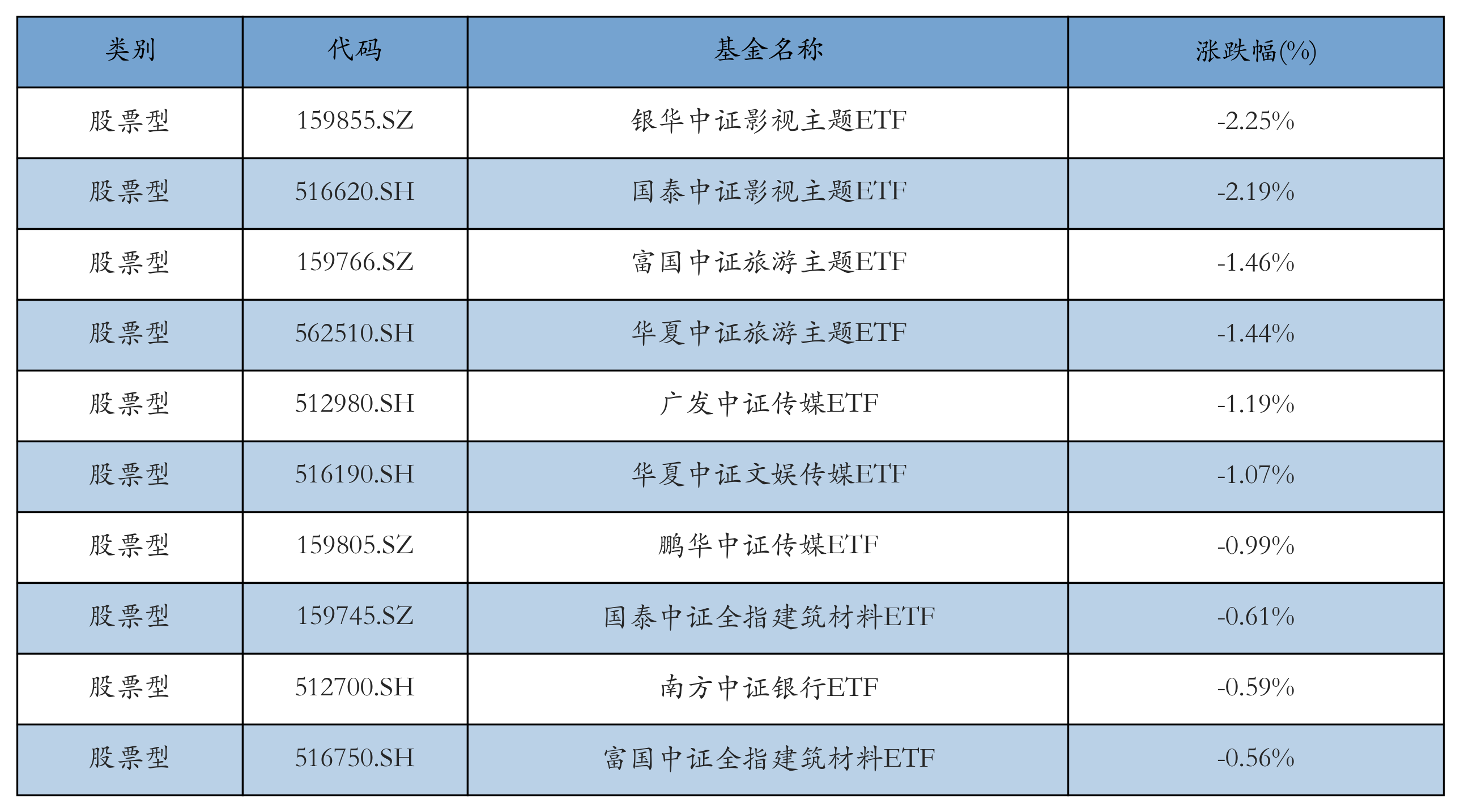 昨日股票型ETF跌幅最大的3只ETF及其收益率分别为:银华中证影视主题ETF(-2.25%)、国泰中证影视主题ETF(-2.19%)、富国中证旅游主题ETF(-1.46%)。跌幅前10详情见下表: