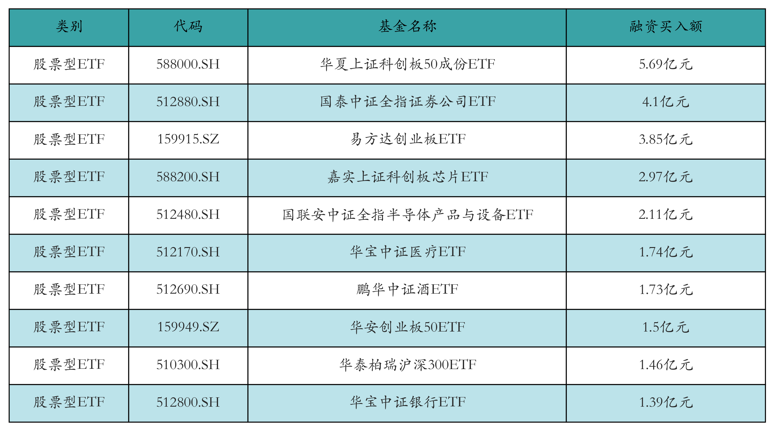 昨日股票型ETF融资买入额最高的3只ETF及其买入金额分别为:华夏上证科创板50成份ETF(5.69亿元)、国泰中证全指证券公司ETF(4.1亿元)、易方达创业板ETF(3.85亿元)。融资买入额前10详情见下表: