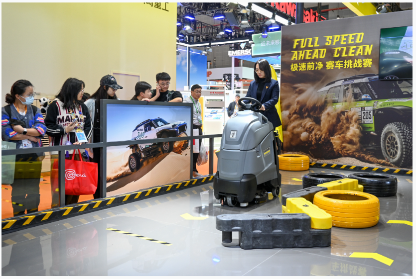 观众在体验卡赫站立式洗地机,直观感受产品的性能和操控体验。澎湃新闻记者 朱伟辉 图