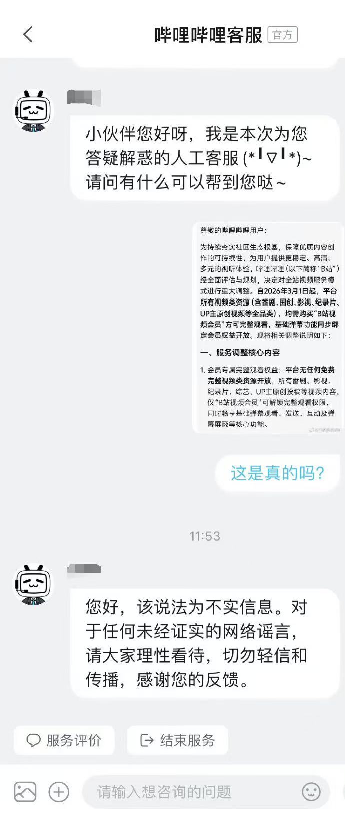 21财经《辟谣财知道》注意到,近日,一条关于哔哩哔哩(下称“B站”)致用户的截图在网络流传。截图内容称,“自2026年3月1日起,哔哩哔哩平台所有视频类资源均需购买B站视频会员方可完整观看,基础弹幕功能同步绑定会员权益开放。”服务调整核心内容指出,平台无任何免费完整视频类资源开放,引发社会广泛关注。
