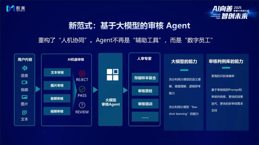 内容风控的工作流也在改变。21记者了解到,数美是小红书、B站等多家互联网平台的服务商,内容审核方面,互联网平台长期沿用的是“机审 + 人审”的标准流程:先机器大规模筛查,将可疑内容打上标签,再由人工复审。但人工审核成本高、耗时长,审核员长期暴露在暴力、色情、仇恨等不健康信息中,而且在规模放大和对抗更激烈的背景下,这套模式已难以跟上防御节奏。