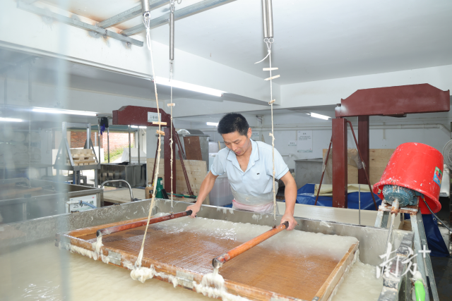 肇庆纸言纸语古法造纸研学基地,依托四会古法造纸技艺,打造省内首家以“古法造纸”为主题的非遗民宿,并在基地内设置沉浸式非遗教学体验,游客能在此体验整套古法造纸流程。主理人麦瑞聪告诉记者,作为肇庆市中小学生研学实践教育基地,目前基地年接待研学群体超3万人次。“我们将公共文化服务与娱乐、休闲、体验等众多功能结合,既是为了满足公众不同需求,也希望能探索更多非遗传承的创新路径。”麦瑞聪说。