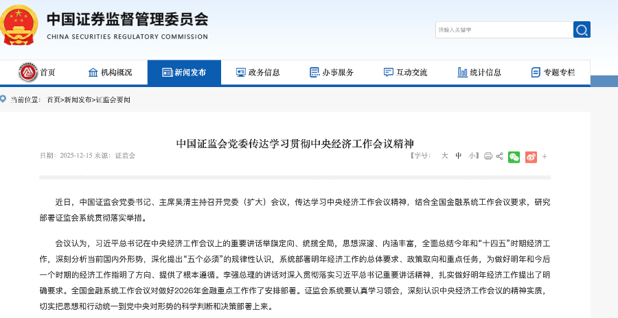 “证监会系统要深入学习贯彻中央经济工作会议精神,认真落实中央经济工作会议部署,按照全国金融系统工作会议安排,坚持稳中求进、提质增效,紧扣防风险、强监管、促高质量发展主线,持续深化资本市场投融资综合改革。”近日,证监会主席吴清主持召开党委(扩大)会议,传达学习中央经济工作会议精神。