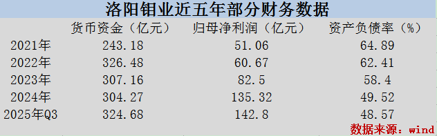 截至今年三季度末,洛阳钼业账面货币资金接近325亿元,期末资产负债率由2021年末的64.89%降至48.57%,后续还有较大的“加杠杆”空间。