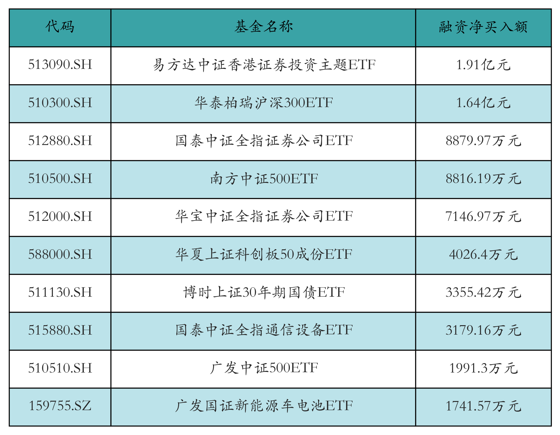 12月12日ETF融资净买入额前三位分别为:易方达中证香港证券投资主题ETF(1.91亿元)、华泰柏瑞沪深300ETF(1.64亿元)和国泰中证全指证券公司ETF(8879.97万元),前10具体见下表:
