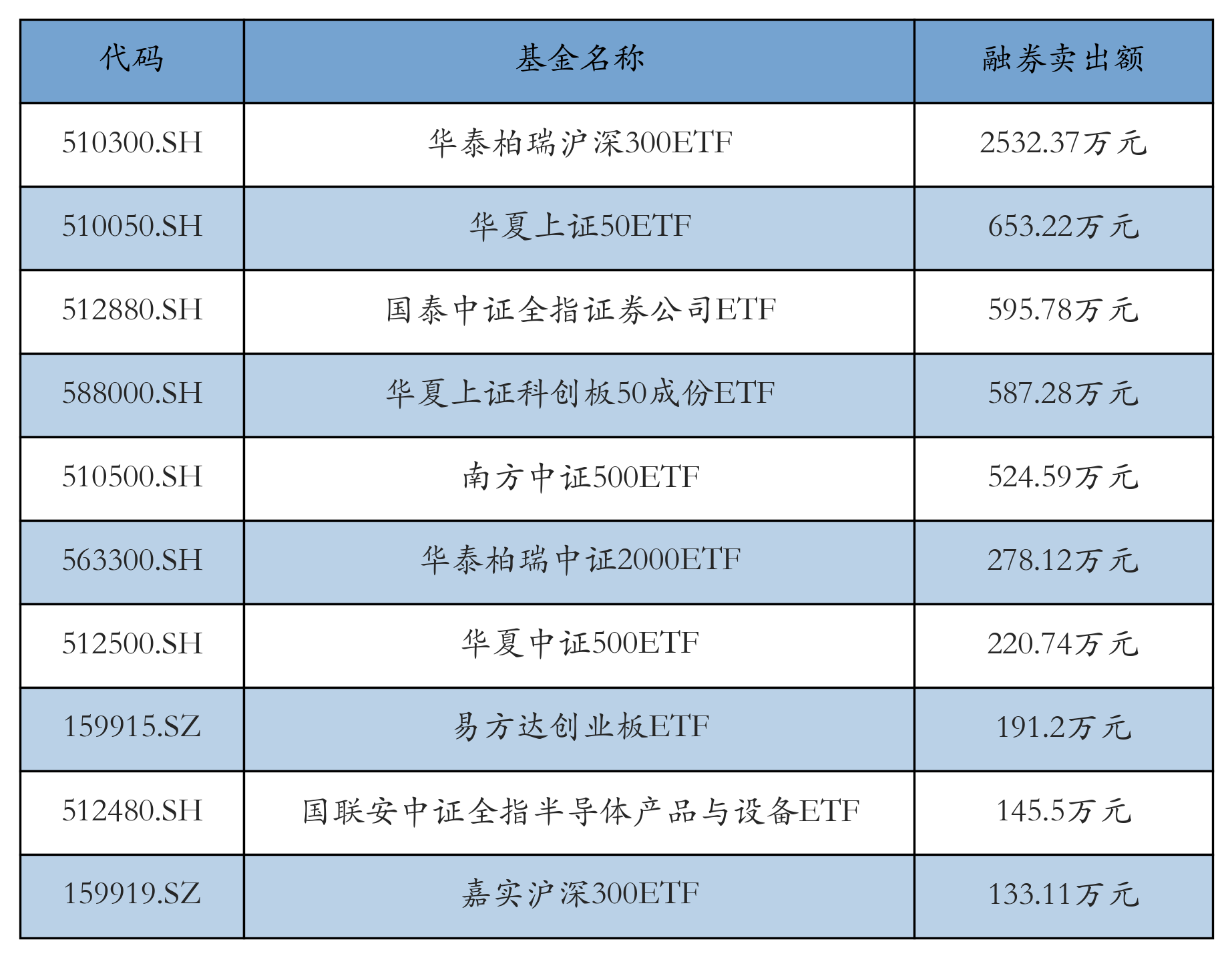 12月12日ETF融券卖出额前三位分别为:华泰柏瑞沪深300ETF(2532.37万元)、华夏上证50ETF(653.22万元)和国泰中证全指证券公司ETF(595.78万元),前10具体见下表: