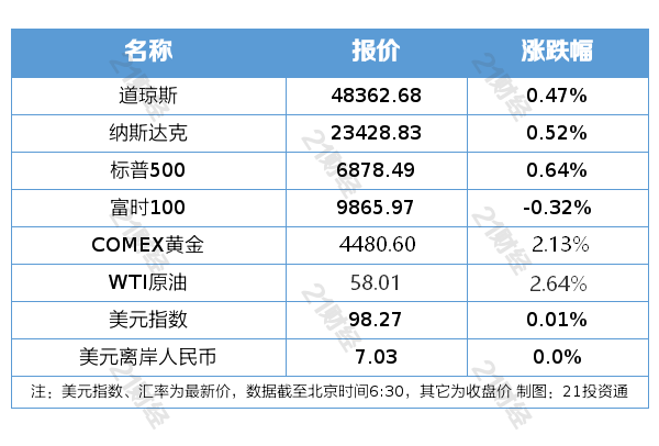 纽约股市三大股指12月22日上涨。截至当天收盘,道琼斯工业平均指数比前一交易日上涨227.79点,收于48362.68点,涨幅为0.47%;标准普尔500种股票指数上涨43.99点,收于6878.49点,涨幅为0.64%;纳斯达克综合指数上涨121.21点,收于23428.83点,涨幅为0.52%。