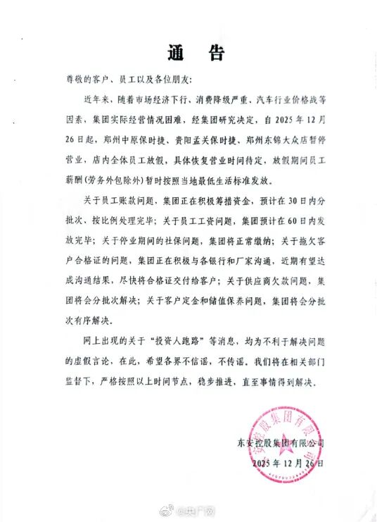 东安集团称,近年来,受汽车行业价格战等因素影响,集团实际经营情况困难,经集团研究决定,自2025年12月26日起,郑州中原保时捷、贵阳孟关保时捷、郑州东锦大众店暂停营业。