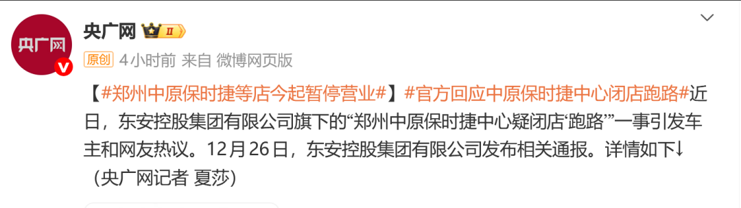 12月26日晚,据央广网,东安集团发布通告,确认了郑州中原保时捷、贵阳孟关保时捷、郑州东锦大众店三家门店暂停营业。