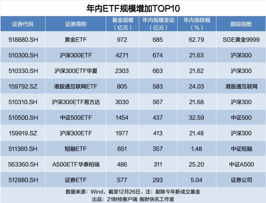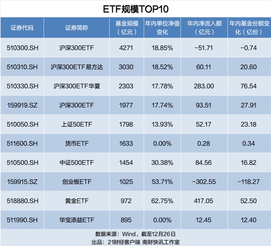 不过,从产品规模格局看,当前宽基指数ETF仍占据绝对主导地位。Wind数据显示,截至12月26日,全市场规模最大的10只ETF中,沪深300相关ETF独占4席。其中,沪深300ETF(510300.SH)更是以4271亿元规模位居榜首,成为全市场唯一突破4000亿元的单品。