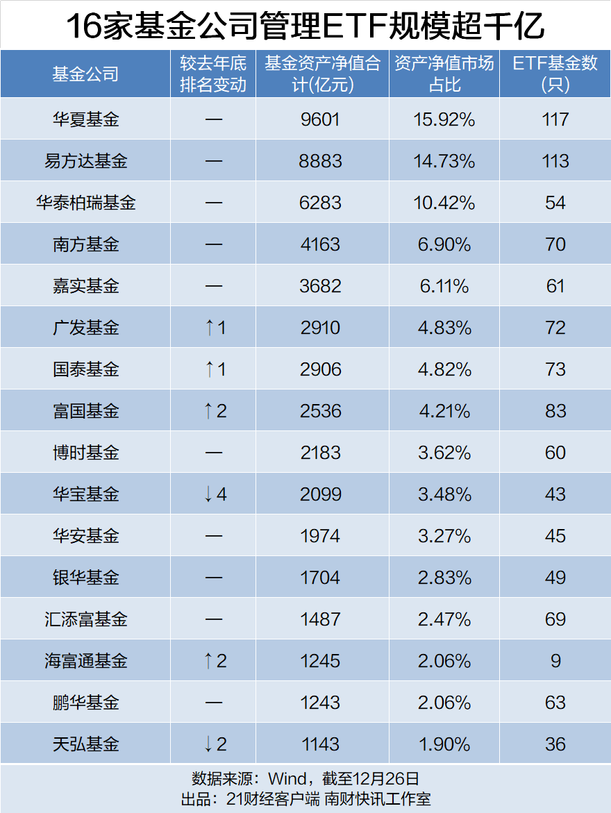 ETF市场的爆发,也重塑了基金行业的竞争版图。截至12月26日,“ETF千亿俱乐部”基金公司数量从2024年底的12家增至16家,汇添富、海富通、鹏华、天弘成为新进成员。而前十大ETF管理人的入围门槛已提升至2000亿元以上。