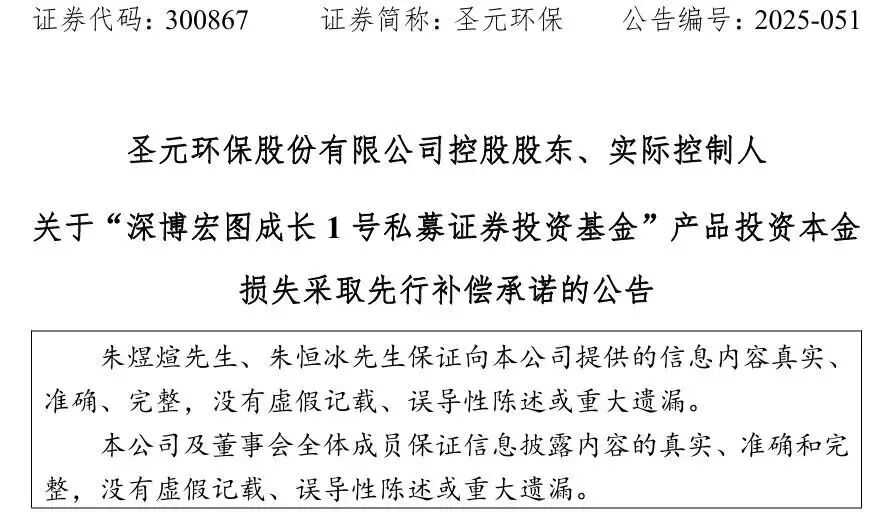 12月27日晚间,圣元环保紧急公告称, 控股股东、实际控制人承诺就基金产品投资本金损失先行补偿。