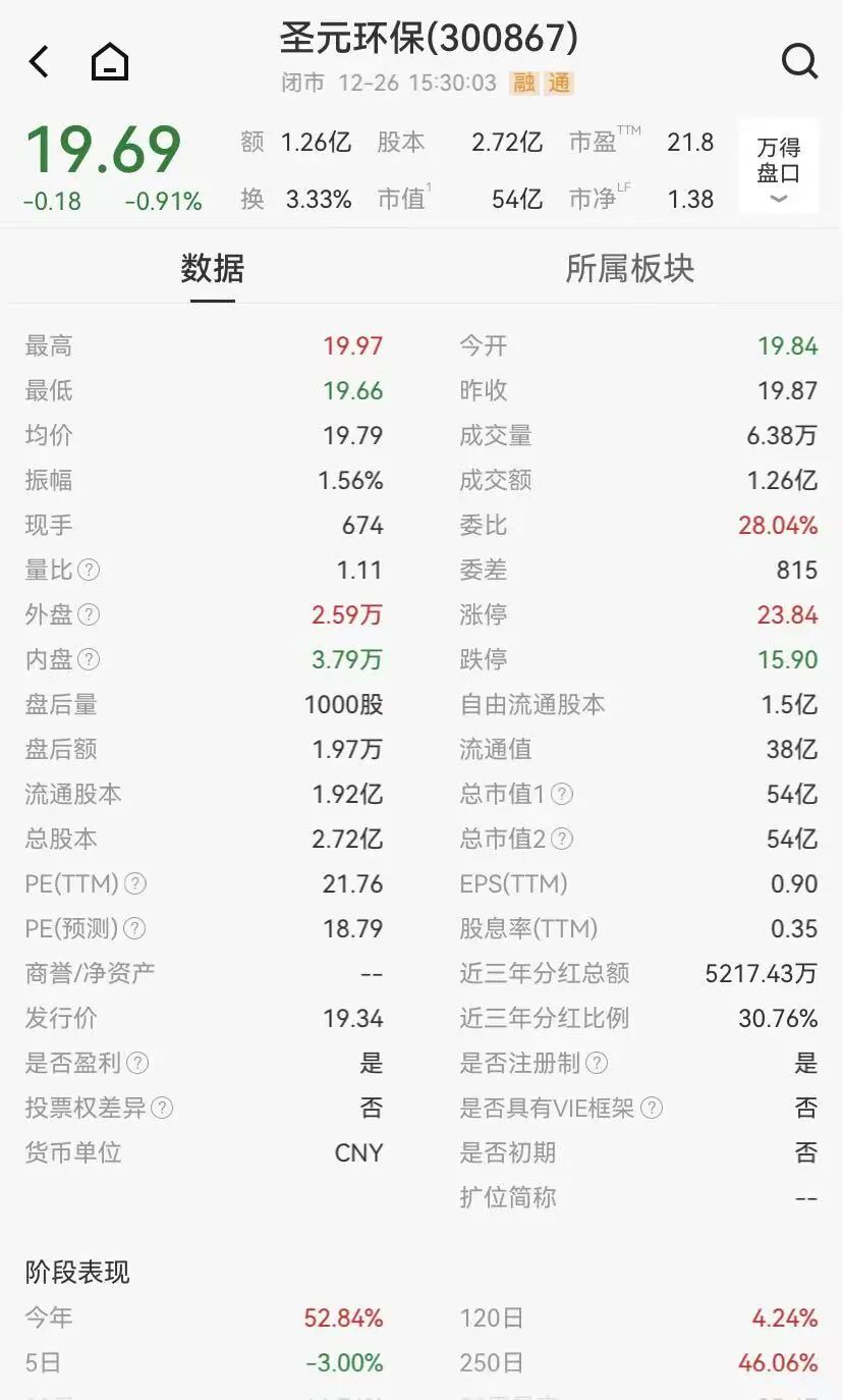 截至12月26日,圣元环保股价收报19.69元/股, 总市值54亿元。 今年以来, 圣元环保累计上涨超52%。