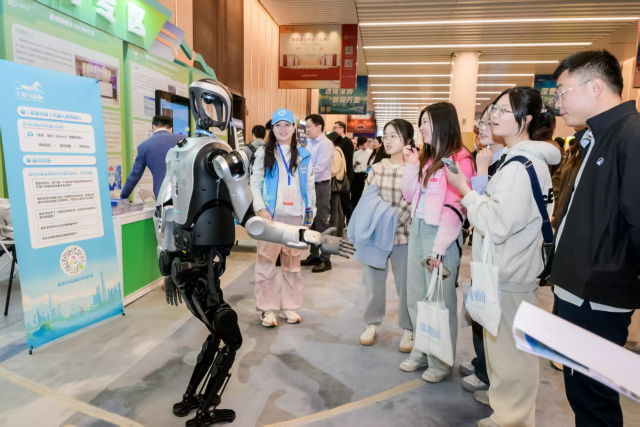 招聘会现场,一条科技感十足的“未来大道”引人驻足。“机器人武林大会”集结了优必选、众擎等具身智能领军企业,人形机器人随乐起舞;比亚迪仰望U9超跑与亿航载人无人机同台。