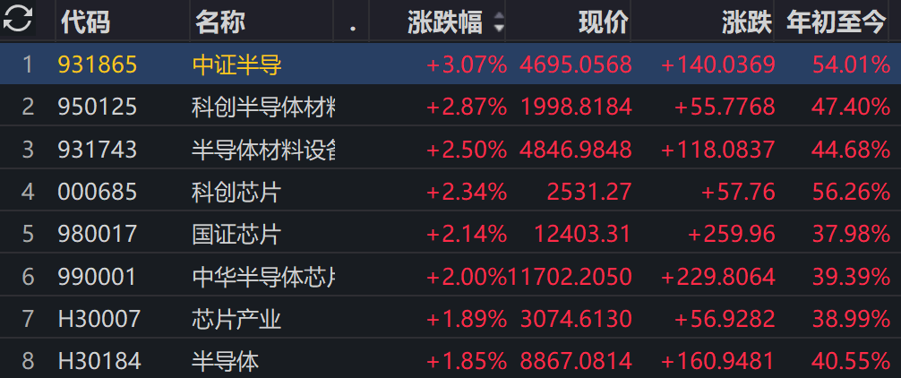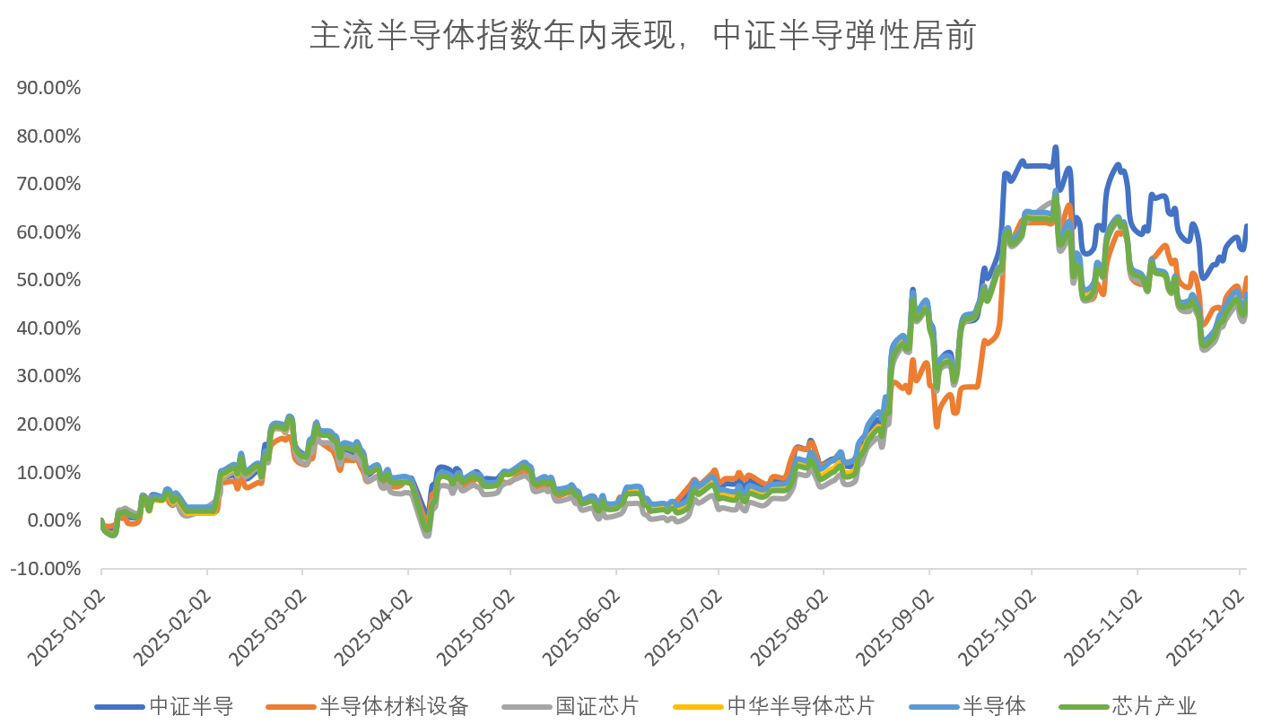 数据显示,截至12月3日,中证半导2025年年内涨幅为54%,区间最大上涨超80%,在中华半导体芯片、国证芯片、芯片产业等主流半导体指数中位列第一。