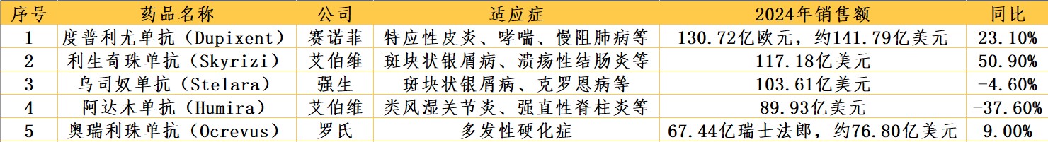随着跨国药企(MNC)陆续披露2024年业绩,21世纪经济报道记者初步统计发现,自免领域的营收排名中,赛诺菲的度普利尤单抗、艾伯维的利生奇珠单抗和阿达木单抗、强生的乌司奴单抗、罗氏的奥瑞利珠单抗位居前5,年内销售额合计529.31亿美元。
